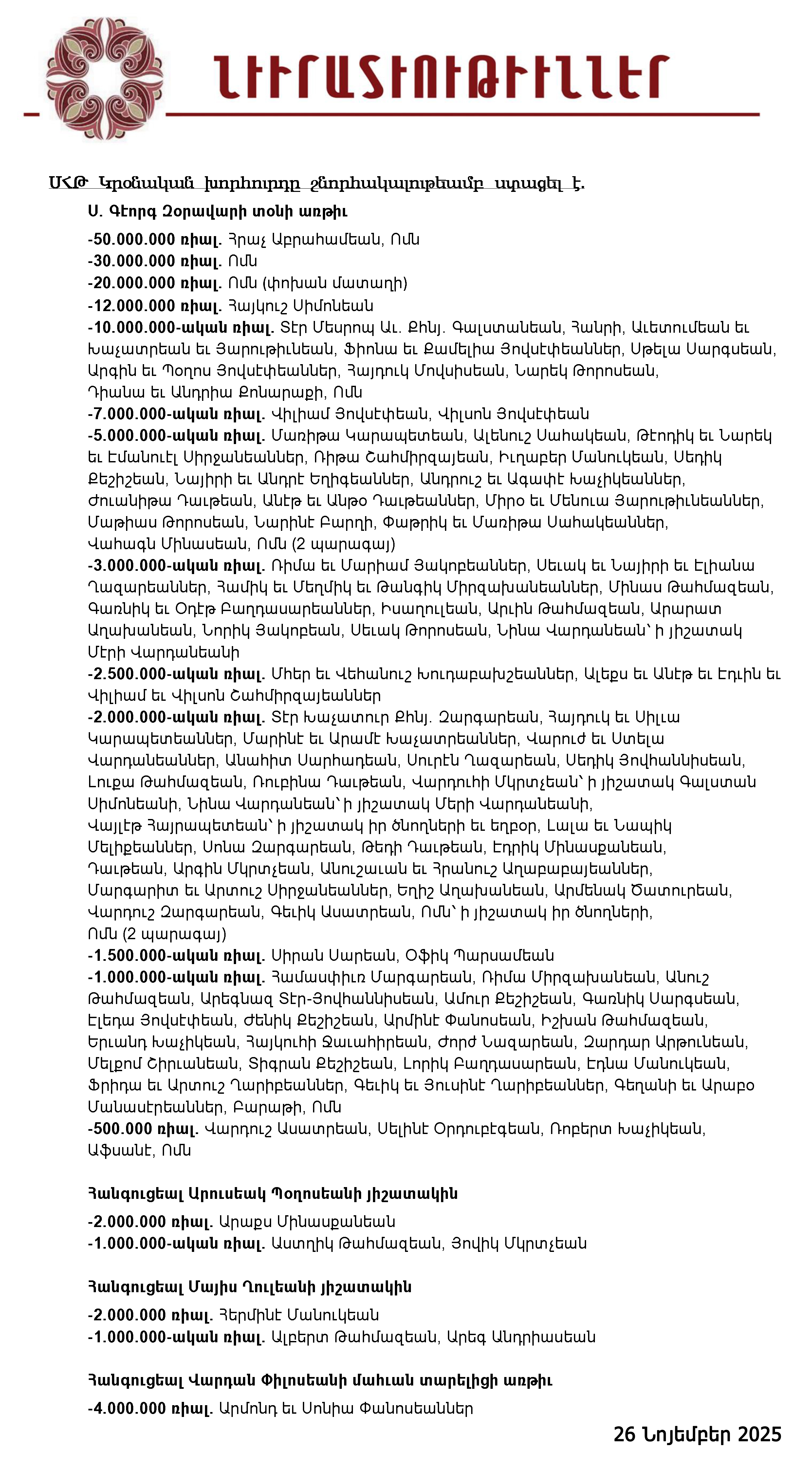 Նւիրատւութիւններ (26 Նոյեմբեր 2025)